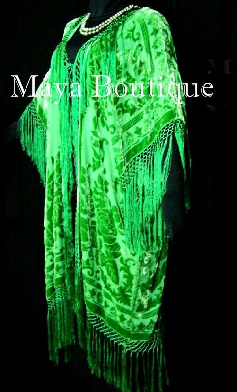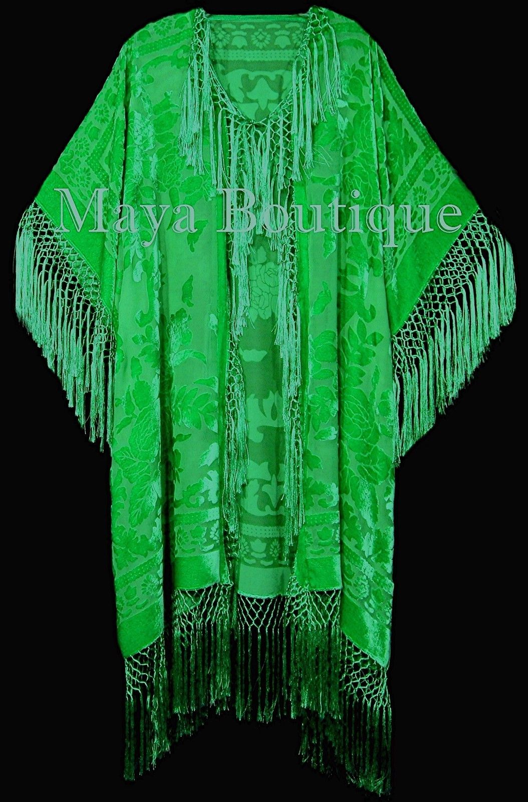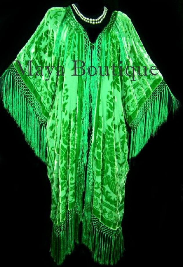 Apple Green fringe kimono burnout velvet jacket opera coat.